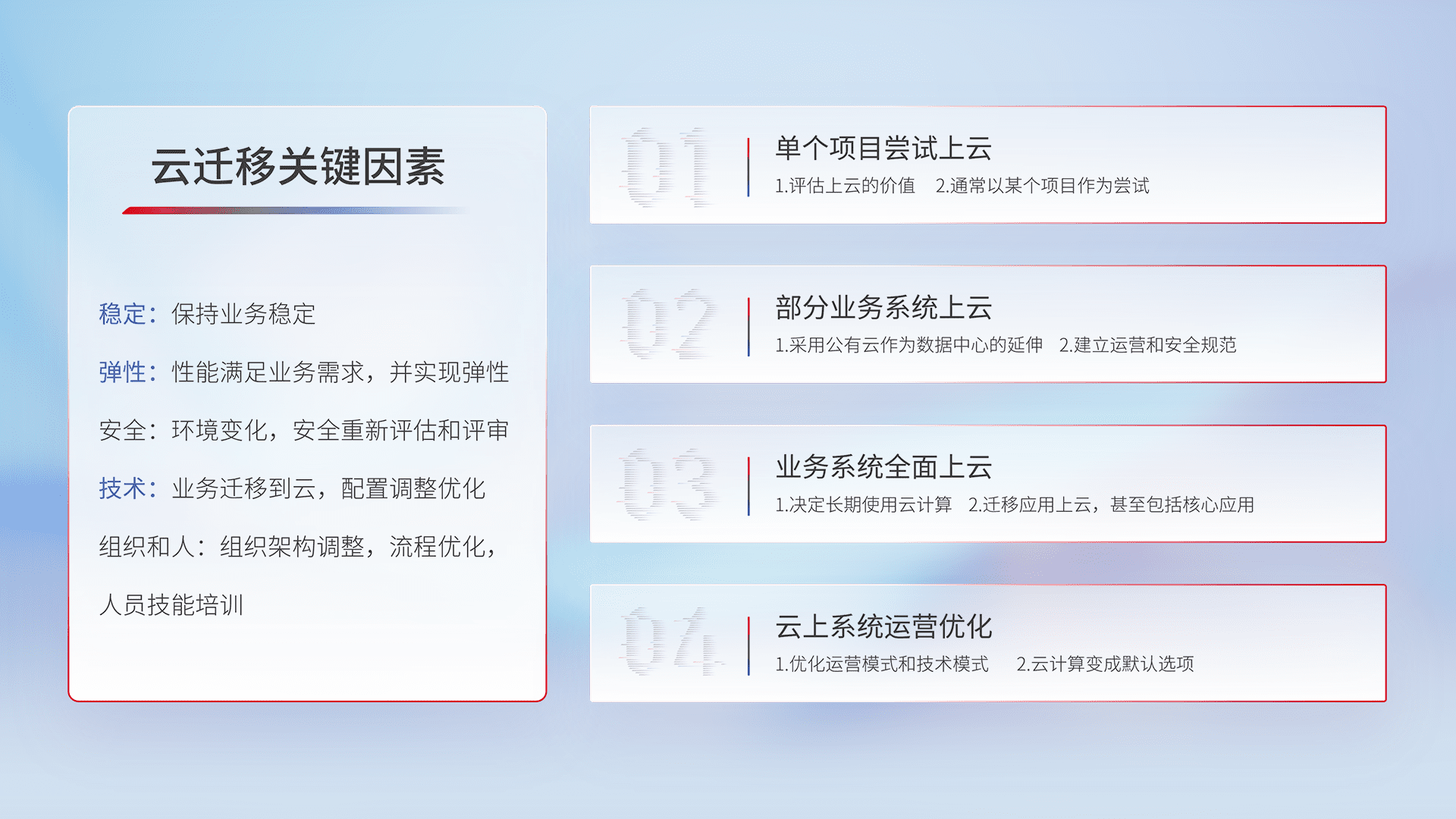 结合实际业务,,从规划设计、、、云平台选型、、云原生改造、、、、数据迁移、、、集成交付,,,迁移全过程为客户识别最佳上云路径,,,,做好风险识别管理,,,,设计网络架构、、身份权限、、安全审计合规、、、操作审计、、、、日志审计、、监控告警策略、、多站点容灾设计等,,对云上基础设施进行整体规划,,提升IT治理水平,,以满足弹性、、、高可用、、、高性能的需求。。