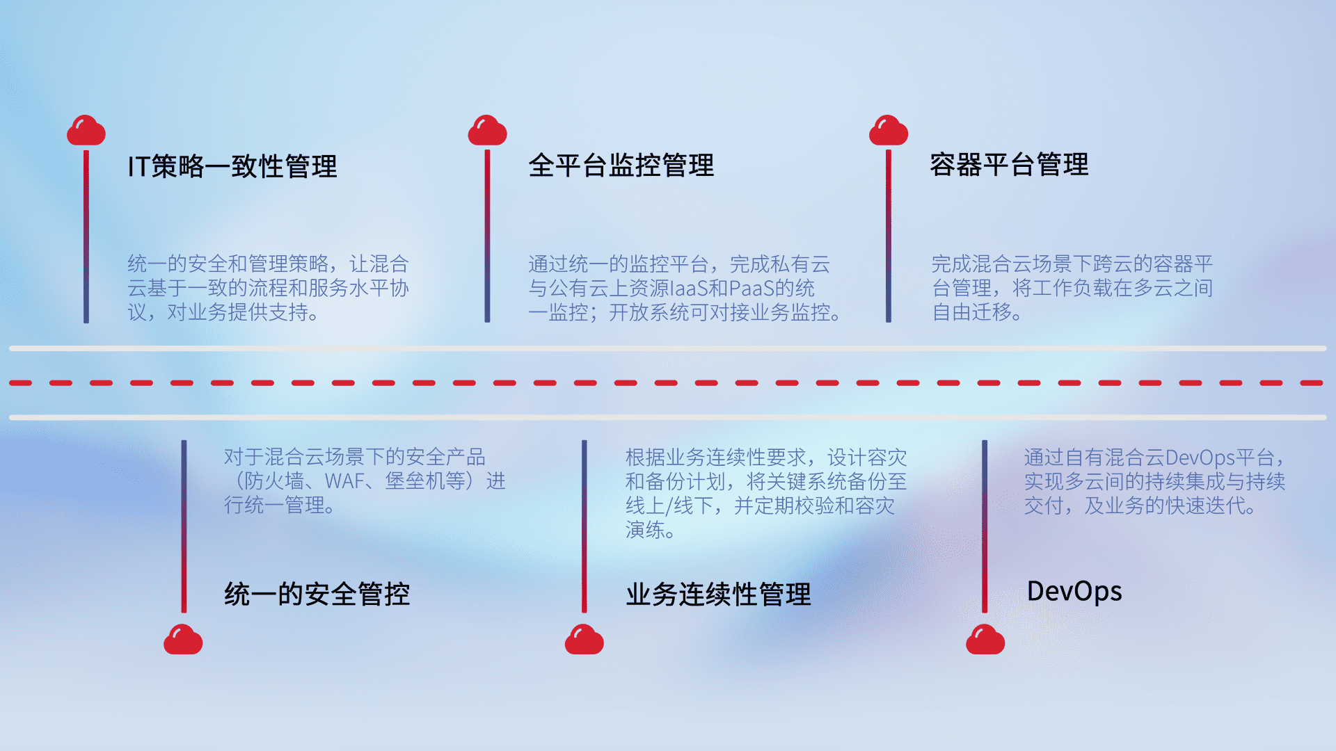 通过多云纳管,,,,以统一的资源数据模型把客户的云资源进行抽象和封装,,,,进而实现对多云资源的统一操作,,保障云资源管理的可靠性、、、稳定性与可用性。。。量身定制化运维内容,,,,配置、、开发运维、、补丁管理、、、、备份、、、监控、、、认证和访问管理、、、审计和日常巡检等,,,,保障在用云过程中的可靠度,,稳定度以及高可用率。。